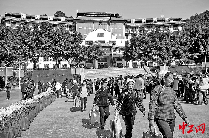 11月23日,在贵州省从江县政府广场,外出务工人员免费领取生活礼包。当日,从江县举行2025年东西部劳务协作有组织输出“专业收割队”活动欢送仪式,首批470余名外出务工人员乘坐免费“就业直通车”前往广东、广西等地从事甘蔗收割工作。