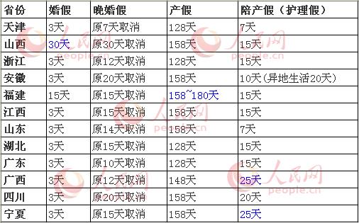 人民网整理发现,目前出台新计生条例的12个省份均取消了晚婚假,同时对产假和男性陪产、护理假做出一定调整。其中,山西、安徽、江西、山东、四川、宁夏6 省份,产假为158天,福建产假最短158天最长可休180天;而天津、浙江、湖北、广东4省份,产假为128天,相差近两个月;陪产、护理假方面,广西和宁夏假期最长,为25天,天津、山东则仅有7天。(具体见表)