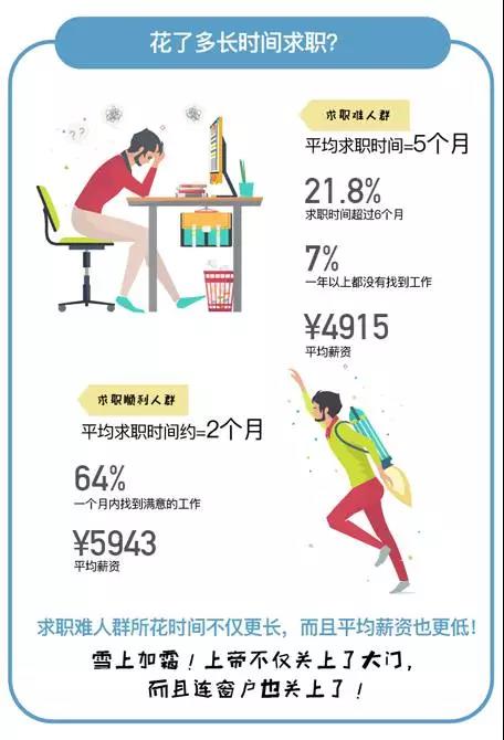 另外,报告显示,被调查人群中有超过21%的大学生找工作比较困难,平均求职过程接近5个月;超过35%的大学生求职非常顺利,平均求职时间仅2个月。并且,从薪资来看,求职难人群的平均薪资也明显更低,与求职顺利人群相比,略低1000元左右。